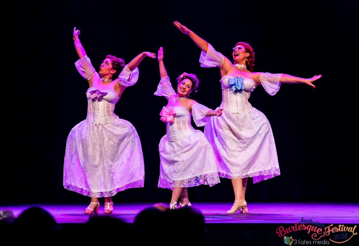 I'm still a very new performer in the crazy world of burlesque, and I love that it's an art form where you absolutely CAN shape shift and play and present a multitude of different personas. At this stage I'm probably known as a very 'classic' performer and I have a passion for burlesque history and paying homage to our burly fore-sisters. I love playing & toying with the audience. I get off a little bit on the power s(trip) of burlesque. I'm also a massive fool though and I love playing dress-ups, exploring character and pop-culture. I'm also a part of a burlesque trio alongside Miss G Veous & Frenchi Holiday called 'Ladies In Waiting' and our style is very much satire & comedy.