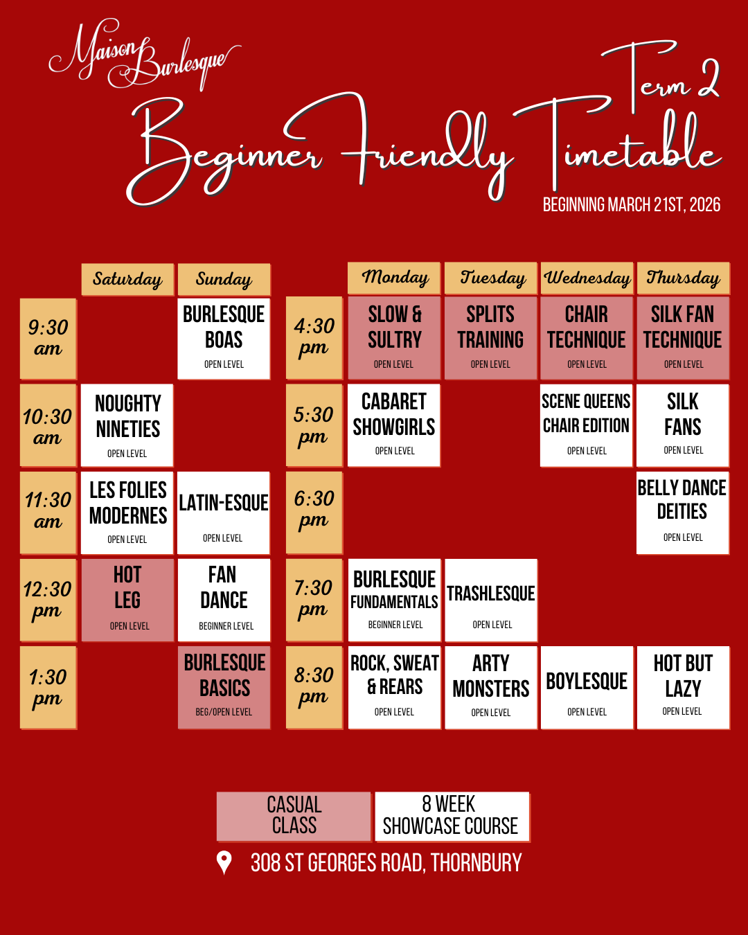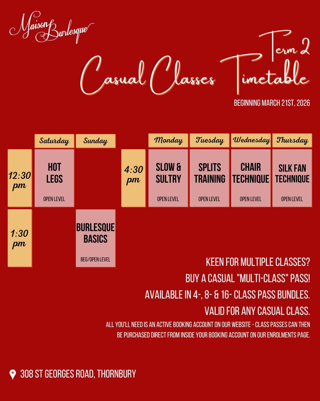Keep scrolling to see our upcoming Term 2 2026 timetable, as well as our current Term 1 Classes timetable.